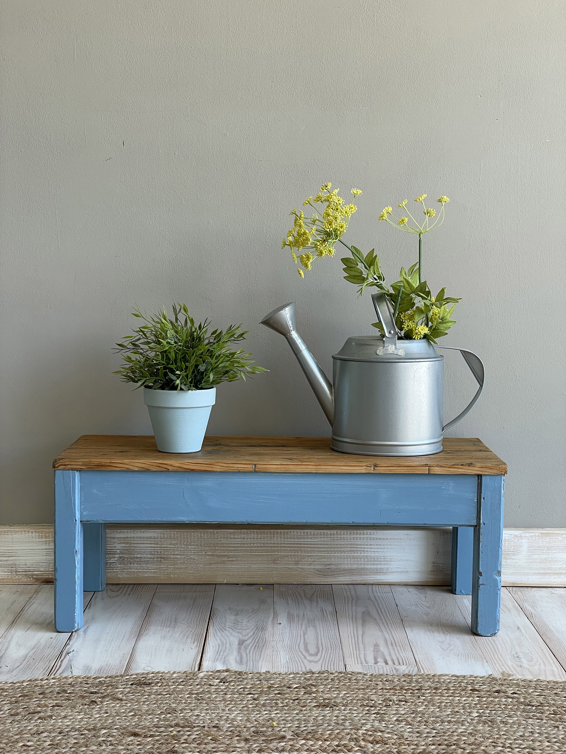 Sobre de color natural de la madera y patas pintadas en color azul real satinado.