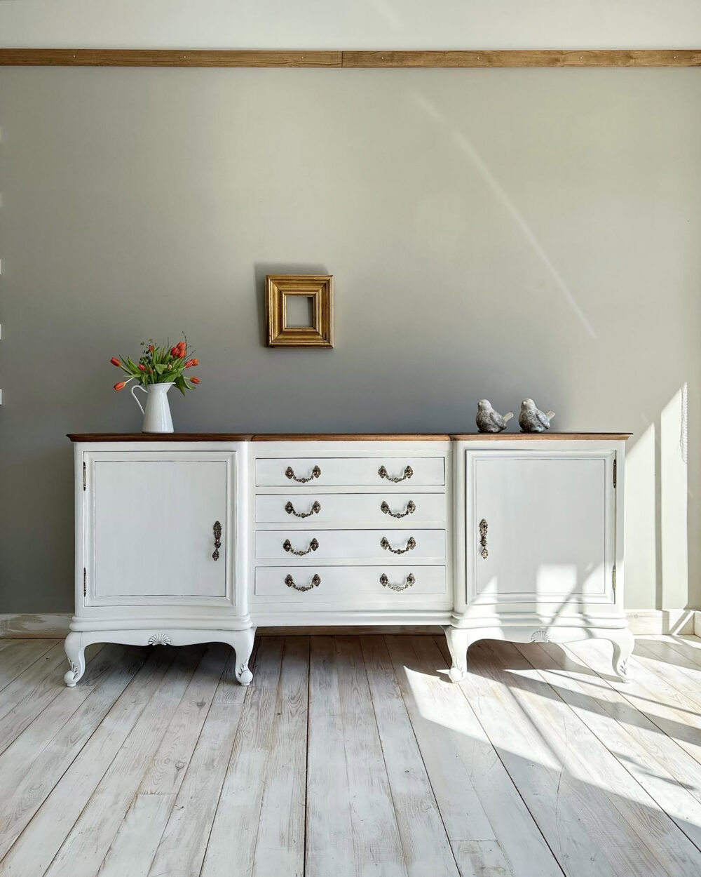 Pintat color milk i una pàtina envellida en blanc efecte empolsat.