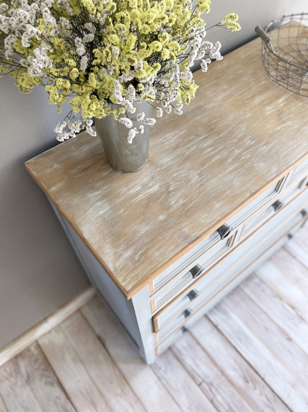 Sobre decapé blanc.