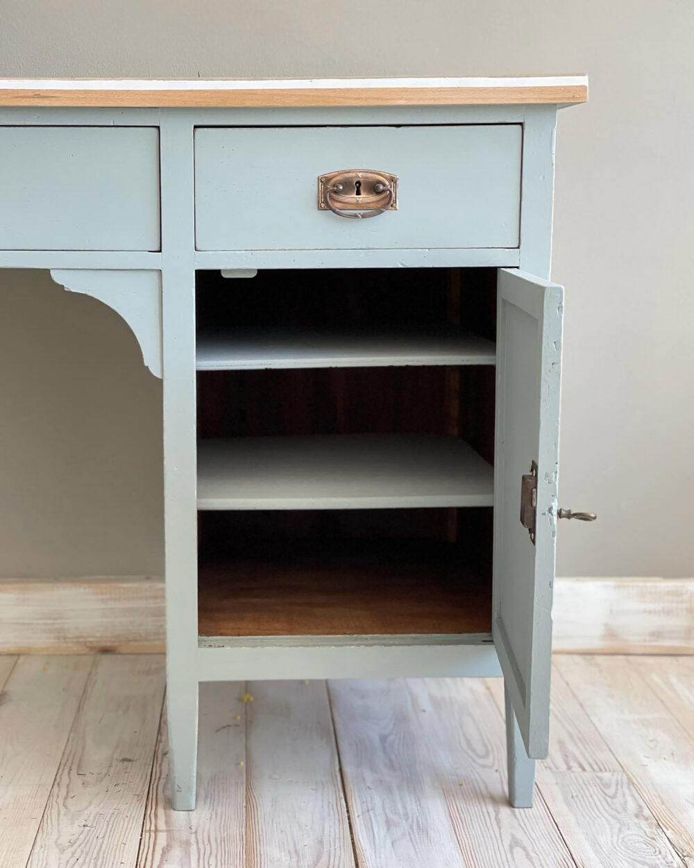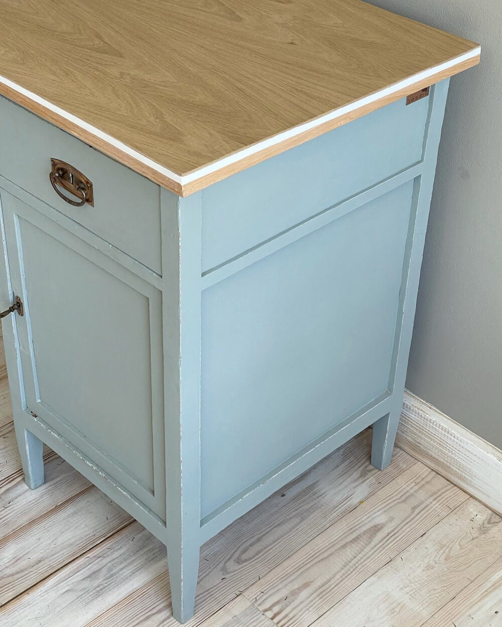 Color blau escandinau amb taulell color natural de fusta de roure.