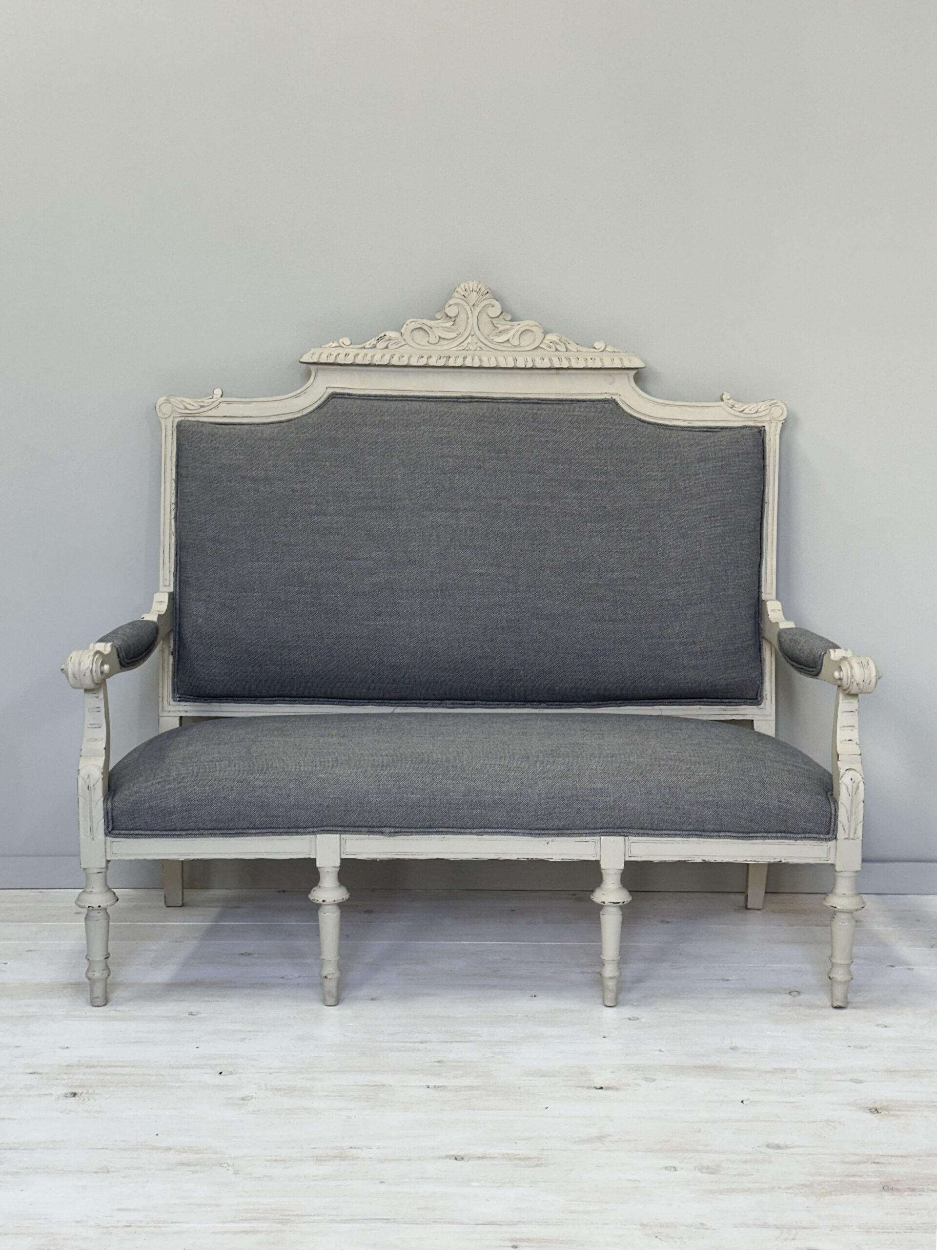 Sofà clàssic amb potes tornejades.