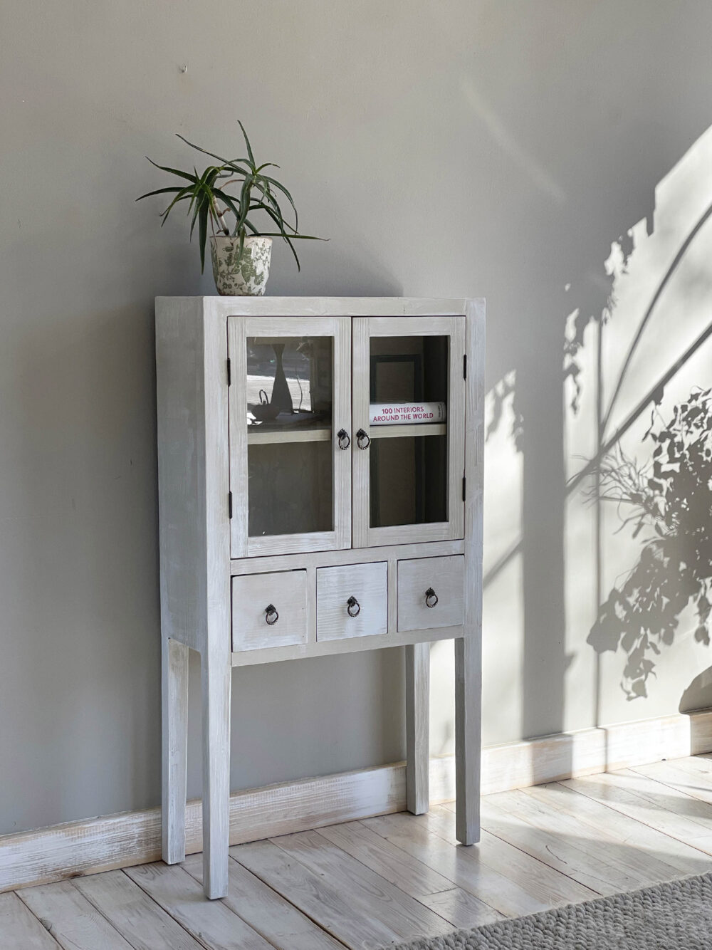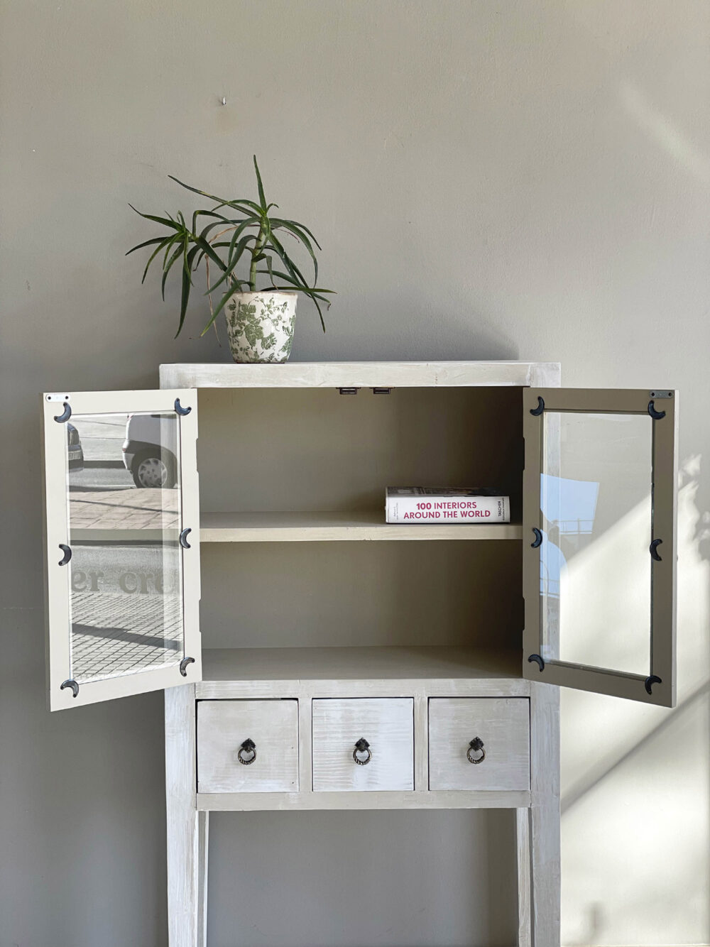 Pintada en decapé bicolor café au lait i acabat en blanc.
